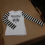 Fitted Ladies shirt with our signature jailbird stripe arms in red white blue black and gold